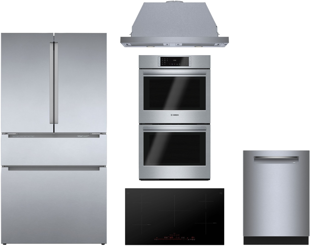 Bosch 5 Piece Stainless Steel Kitchen Package with French door refrigerator, built in dishwasher, double electric wall oven, induction cooktop and under cabinet range hood.Read More