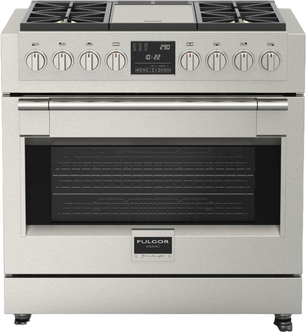 This all-new 36” dual fuel range comes with 4 burners and a central griddle. Each burner features our 5-in-1 Crescendo burner beneath our continuous heavy-duty cast-iron grates with a Trilaminate Stainless Steel griddle, providing unparalleled flexibility. The Crescendo burner has the power to sear, sauté, and boil but also the control to temper and simmer the most delicate dishes.Read More