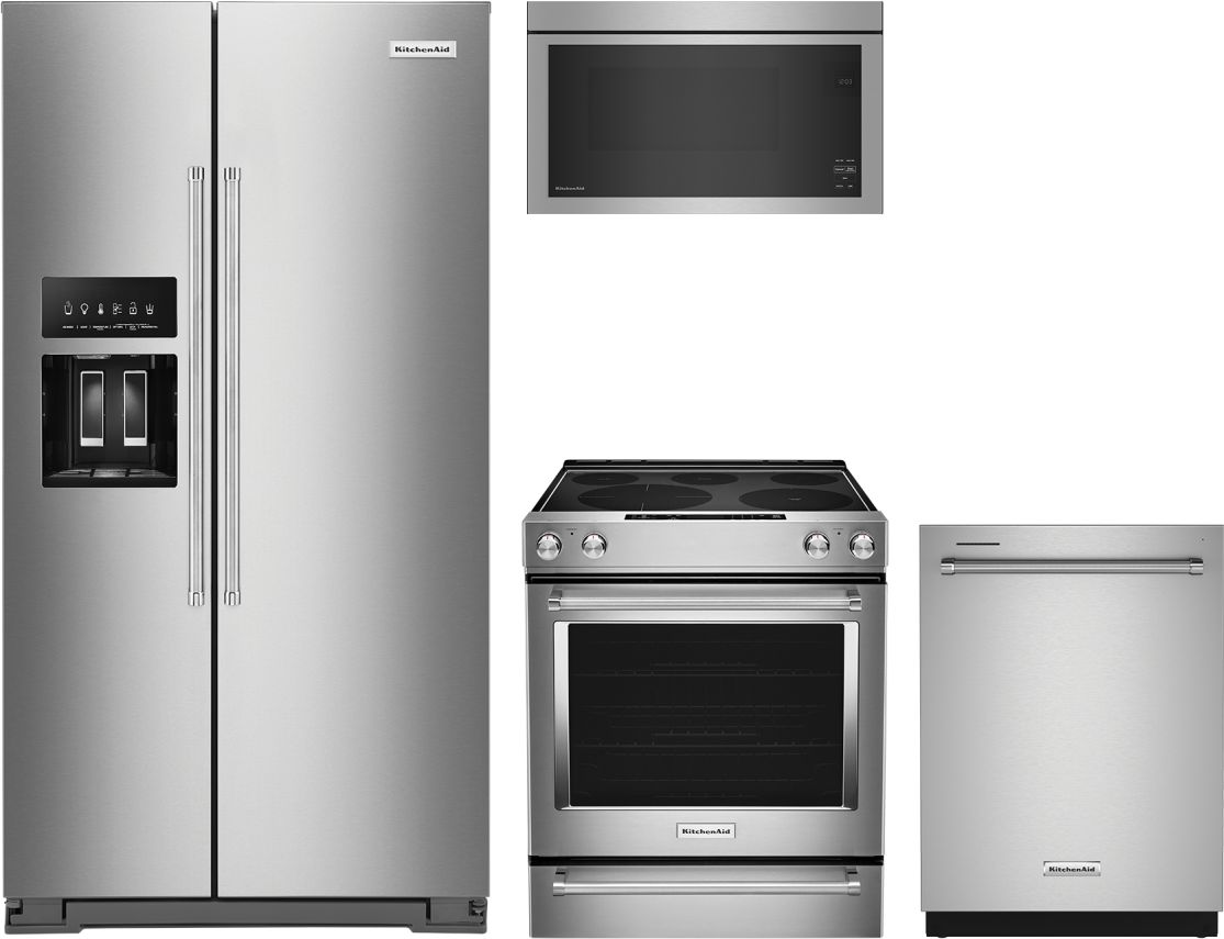 KitchenAid® 4 Piece Stainless Steel Kitchen Package with a side-by-side refrigerator, free standing electric range, over the range microwave and built in dishwasher.Read More