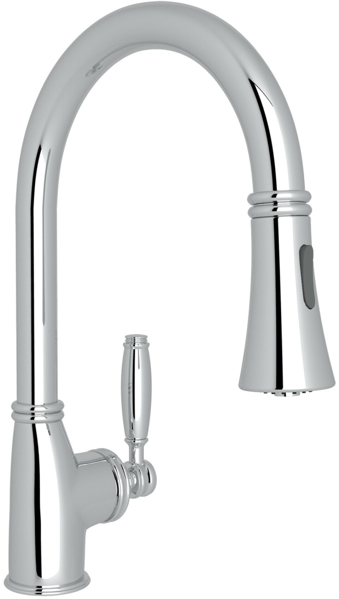 The streamlined, sleek loop of the faucet is balanced by a single lever handle reaching skyward. Luxurious shine, notched detailing, and a fluted spout add Deco styling. Gotham is truly a must for modern and transitional kitchens of style.