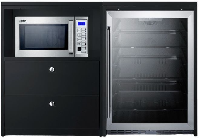 Each cabinet piece is manufactured in the USA from engineered wood in a jet black laminate finish. The CWM2ADA cabinet includes two slide-out drawers and a cutout to house the microwave or another small appliance. It features a pre-installed hole in the rear to let you run power cords through, accommodating the microwave as well as other small appliances, such as coffeemakers or toasters. The SCM853 is a 900W microwave in stainless steel. Beverage center AL57G offers a full 5 cu.ft. of storage capacity, with no-frost operation, digital temperature control, adjustable glass shelves, and LED lighting. It comes with a user-reversible stainless steel trimmed glass door and front lock.