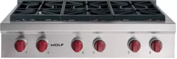 Wolf® 36" Sealed Burner Rangetop-Stainless Steel with dual stacked sealed burners and distinctive red control knobsRead More