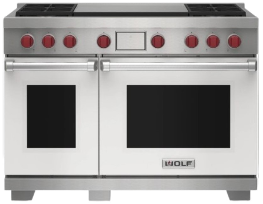 Wolf® 48" Stainless Steel Pro Style Dual Fuel Range with White Door features dual-stacked, sealed burners, Dual VertiFlow™ convection system, Gourmet Mode, 10 chef-created cooking modes, LED backlit control bezels, self-clean, delayed start, timed cook, and Sabbath features.Read More