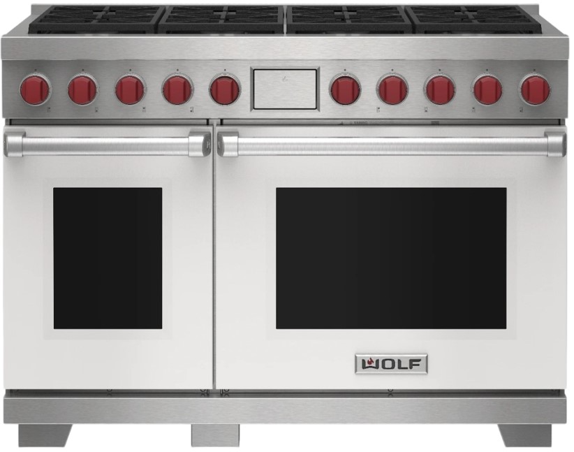 Wolf® 48" Stainless Steel Pro Style Dual Fuel Range with White Door features dual-stacked, sealed burners, Dual VertiFlow™ convection system, Gourmet Mode, 10 chef-created cooking modes, LED backlit control bezels, self-clean, delayed start, timed cook, and Sabbath features.Read More